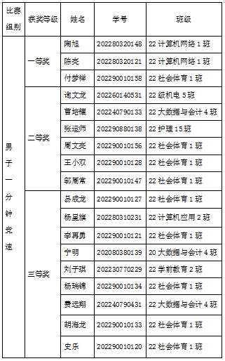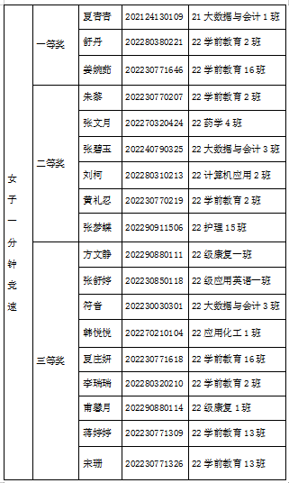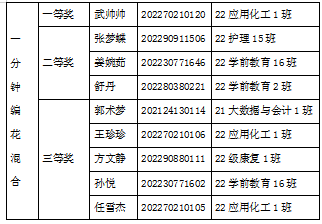 本次比赛共设一分钟男子竞速、一分钟女子竞速和一分钟编花混合三个组别,每个组别分设一、二、三等奖,比赛吸引了各学院数百名学生参加。最终经过初赛、半决赛和决赛三轮比拼,各个组别的获奖选手名单先后出炉。三个组别的冠军分别被信息工程学院的陶旭、经济管理学院的夏青青、制药与材料学院的武帅帅等7位同学斩获;智能制造学院的询文龙、人文与外国语学院的朱黎、医学院的张梦蝶等15位同学获得二等奖;三等奖被公共教育学院的易成龙、医学院的方文静、经济管理学院的郭术梦等23位同学获得。