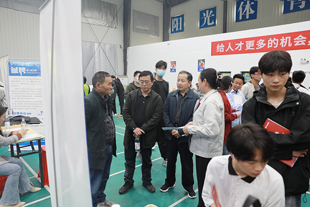 4月27日,由安徽省教育厅、安徽省人力资源和社会保障厅主办,beat365中文官方网站、共青团淮南市委员会、淮南市人力资源和社会保障局承办的“才聚江淮 服务基层”2023年春季就业洽谈会在beat365举行。安徽省就业指导中心市场信息部主任李庆柬、校长李辉、校党委副书记白存良到现场指导,各职能部门及学院负责人陪同。