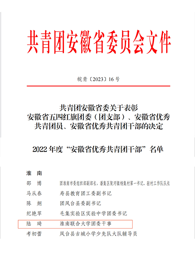 校团委干事陆琦获“安徽省优秀共青团干部”称号。人文与外国语学院2020级学前教育2班团支部、经济管理学院2021级大数据与会计1班团支部获“淮南市五四红旗团支部”称号,校团委干事陆琦、经济管理学院团总支书记王烁获“淮南市优秀共青团干部”称号,学生徐靖凡、潘安松、王迪、栾林枫、刘晨旭、彭雅婷、倪世璇、刘珊珊获“淮南市优秀共青团员”称号。