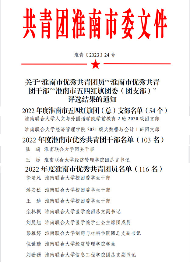 为表彰先进、树立典型,引导和激励全省各级团组织和广大团员、团干部在团的建设和各项工作中创先争优的担当作为,近日,共青团安徽省委、共青团淮南市委对先进团组织和优秀团员、团干部进行了表彰。beat365在2022年度省、市“两红两优”表彰中获得多项荣誉。