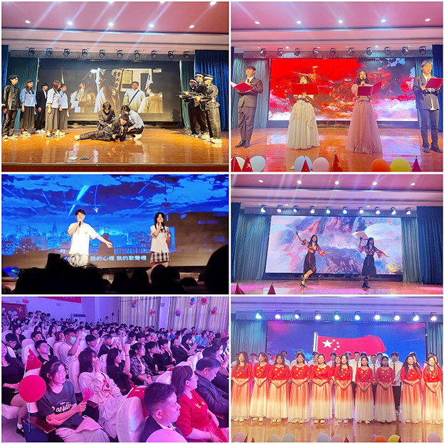 话剧《觉醒》,表演者以革命青年追求真理的坎坷经历为辅助线,艺术地再现了一百年前中国的先进分子和一群热血青年演绎出的一段追求真理、燃烧理想的澎湃岁月! 歌曲《我的歌声里》,甜美的歌声将现场观众拉进现实的生活里。文艺演出接近尾声,师生们满怀激情,共同合唱《我的中国心》,用铿锵有力的歌声唱出了对党和祖国深情的赞美和祝福,抒发了对美好生活的信心和勇气,坚定了为共产主义奋斗的理想和信念。