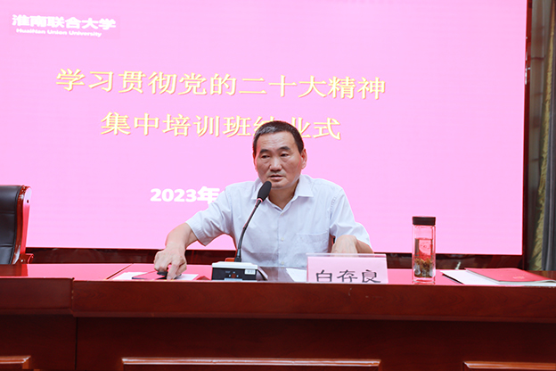 白存良在总结讲话中指出,本次轮训班组织周密,安排紧凑,内容丰富,方式灵活,达到了预期的目标,取得了良好效果。他要求,大家以这次集中轮训班学习为新起点,在全面学习、全面把握、全面落实上持续用力,真正做到学识用贯通,知信行统一,并就持续深化学习宣传贯彻落实党的二十大精神提出了三点要求,一是坚持学有所悟,不断提高自身政治能力;二是坚持悟有所行,在实干中主动担当作为;三是坚持行有所道,加快推动学校发展质量整体跃升。