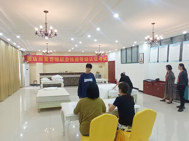 为顺利举办这次1+X证书考试,学院领导积极配合中国饭店协会做好考务衔接工作,在考前培训、组织报考、考场布置、考务安排等各方面精心准备,确保考试有序进行。“1+X”酒店运营管理职业技能等级证书(中级)考试由理论(机考)和实操考核两部分组成。理论(机考)考核在实训楼机房展开,实操分为英语口语、前厅和客房三个部分,对学生的理论素养、英语口语能力和实操能力进行了全面考查。