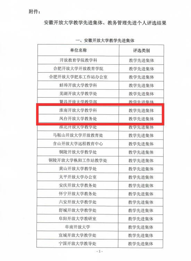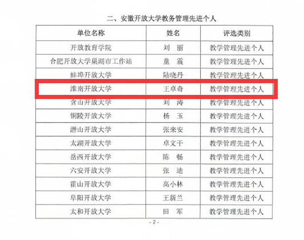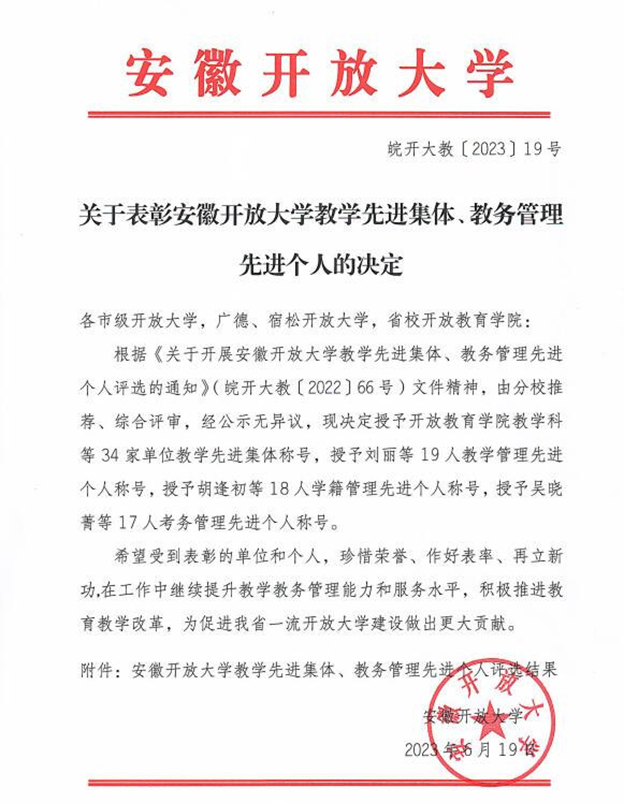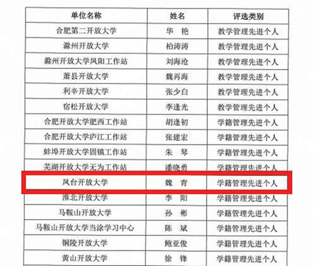 根据安徽开放大学《关于表彰安徽开放大学教学先进集体、教务管理先进个人的决定》(皖开大教〔2023〕19号)文件获悉,淮南开放大学教学科和凤台开放大学教务处荣获“安徽开放大学教学先进集体”称号,教学科王卓奇老师荣获“安徽开放大学教学管理先进个人”称号,凤台开放大学魏青荣获“安徽开放大学学籍管理先进个人”称号。