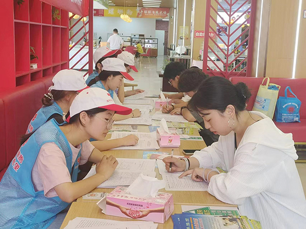 活动中,爱心社志愿者引导积极参与无偿献血的师生们有条不紊地进行填表登记、测量血压、检验血型、领取补给、采集血液等流程。