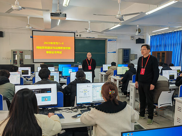 为全面贯彻落实《国家职业教育改革实施方案》精神,完成学院年初制订的“1+X”证书考证计划。11月25日,信息工程学院在西教学楼网络技术实训室和软件实训室开展了“1+X”网络系统建设与运维、大数据应用开发(Java)两项职业技能等级证书考核工作。信息工程学院二年级学生175人参加了考核。副校长邓琪,副校长罗鸿,实训中心和信息工程学院负责同志到场巡查督导。