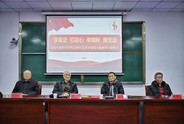 为深入推进学习贯彻习近平新时代中国特色社会主义思想主题教育,12月11日下午,继续教育学院党支部与淮南市新四军联合会铁军艺术合唱团共学军史、共上党课,淮南市原市长、淮南市新四军研究会名誉会长宋长汉出席并授课,校党委副书记白存良、淮南市新四军研究会常务副会长刘德文、樊传德以及铁军艺术合唱团成员、继续教育学院全体人员参加学习。