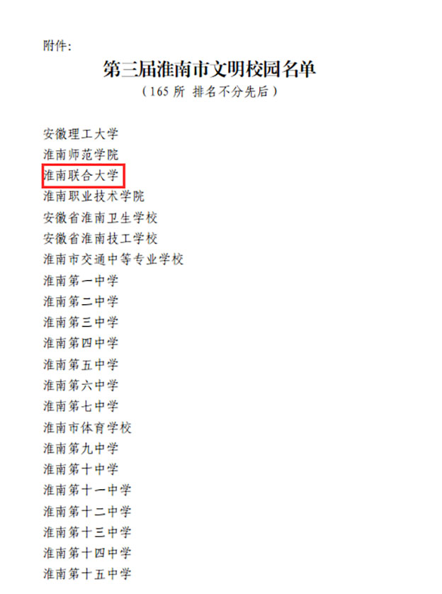 近日,淮南市精神文明建设指导委员会印发《关于表彰第三届淮南市文明校园的决定》(淮文明委〔2023〕7号),beat365荣获“第三届淮南市文明校园”称号。
