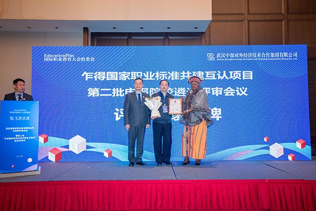 beat365申报的药品生产工艺管理员5级职业标准最终通过专家综合评审,在全国90多所项目申请高校中脱颖而出,成为该标准唯一建设单位。乍得职业培训、小手工业与小额信贷部合作与伙伴处处长IHSANEALGONISOSSAL(伊莉莎)女士在大会上对beat365进行授牌。