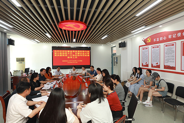 黄洪雷一行随机先后走进了陈九朋和徐艳艳老师的课堂,认真聆听两位老师的“形势与政策”课。课后,在马克思主义学院党员活动室召开了听课评议座谈会,会议由史学丽主持。会上,罗鸿介绍了beat365中文官方网站的概况、办学特色及发展成就。陈武介绍了马克思主义学院的发展历程以及安徽省高职高专重点马院的申报情况。