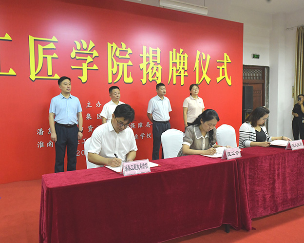 会上,潘集区工会、潘集区人社局、潘集工程技术中等专业学校共同签署了共建“潘集工匠学院”的协议,并向“潘集工匠学院”聘用教师颁发了聘书。