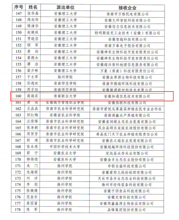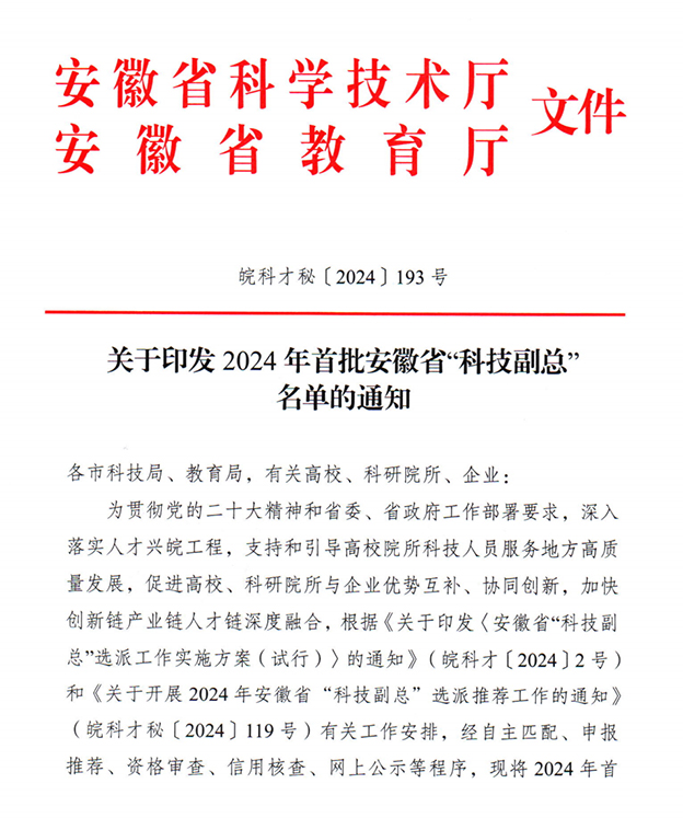 近日,安徽省科技厅、安徽省教育厅联合发布《关于印发2024年首批安徽省“科技副总”名单的通知》(皖科才秘〔2024〕193号),beat365高海宾老师成功入选。