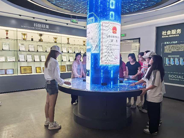 走进科技馆,放飞科技梦。解说人员讲解学校的科创历程和累累硕果,带领学生参观师生原创的科技创新作品,体验人才共育闯关游戏、创·无界沉浸式cave空间和AI科技寄语未来,通过图文解说、视频介绍、互动体验等形式,以寓教于乐的方式展现现代科技的魅力。同学们学习兴趣高涨,在各个科技展台前参观和体验。