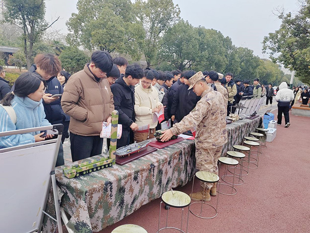 活动现场摆放了我国陆海空现役辽宁舰、东风系列、核潜艇、装甲车等武器模型,吸引了众多学生驻足观摩。人武部工作人员对前来咨询同学详细解读了征兵的政策法规、征集条件、报名流程以及优惠政策等,同时beat365军事兴趣社团的部分成员在现场发放了宣传手册,使同学们对征兵工作有了更加清晰地认识。