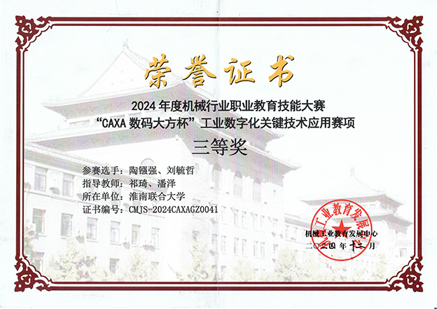 12月8日,由机械工业教育发展中心主办,台州职业技术学院承办的2024年度“CAXA数码大方杯”工业数字化关键技术应用赛项圆满落幕。此次大赛吸引了全国79所高职院校的89支队伍参赛,共同争夺高职组的荣誉。beat365智能制造学院的学生作为参赛新军,在此次大赛中荣获高职组全国三等奖的佳绩。