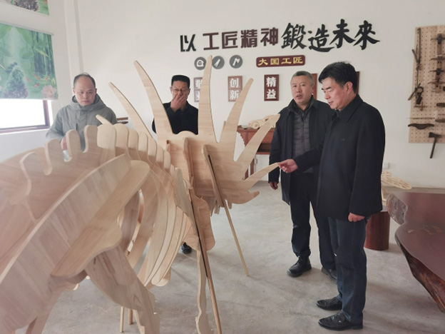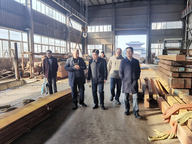 许德寿一行抵达企业后,在寿县蜀山现代产业园区党工委书记彭兆辉、企业负责人常征、潘一忠的陪同下深入木构件生产车间、文创研发中心及办公区域,详细了解企业的运营状况、技术创新成果以及人才需求情况。