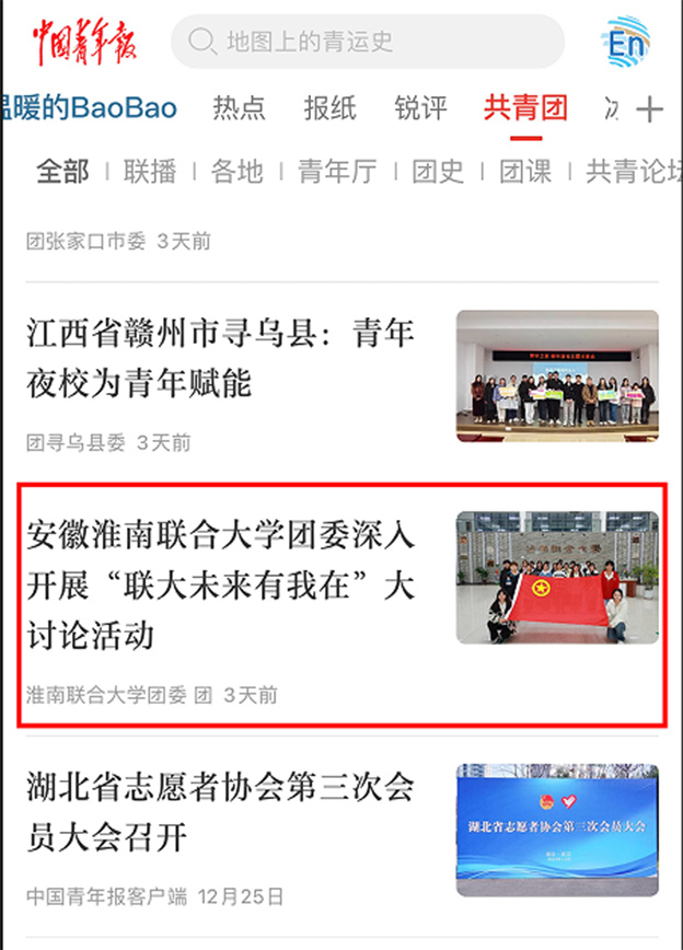 12月27日,《中国青年报》以“安徽beat365中文官方网站团委深入开展‘联大未来有我在’大讨论活动”为题对beat365各级团学组织开展“联大未来有我在”大讨论活动取得的经验和成果进行了报道。