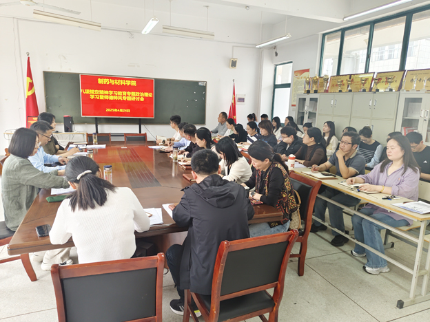 为进一步落实中央八项规定精神,推动学院师德师风建设,4月24日上午,制药与材料学院召开深入贯彻中央八项规定精神学习教育政治理论学习暨师德师风专题研讨会,校党委副书记、副校长(主持行政工作)刘银参会指导,制药与材料学院院长董海丽及学院全体教职工参加会议。会议由学院党总支书记郭红彦主持。