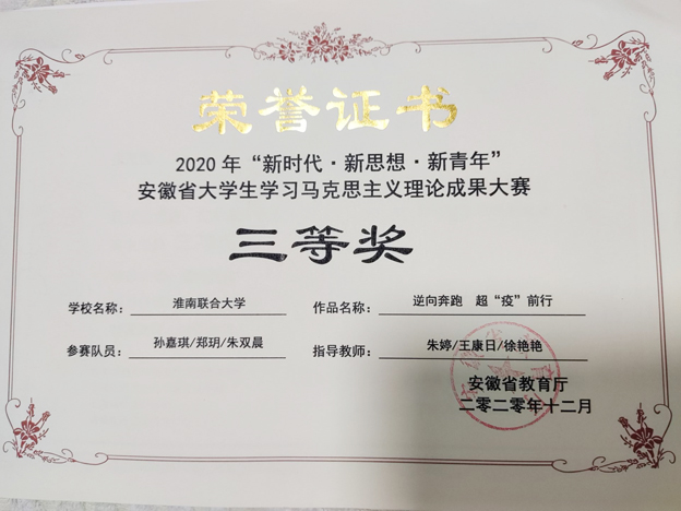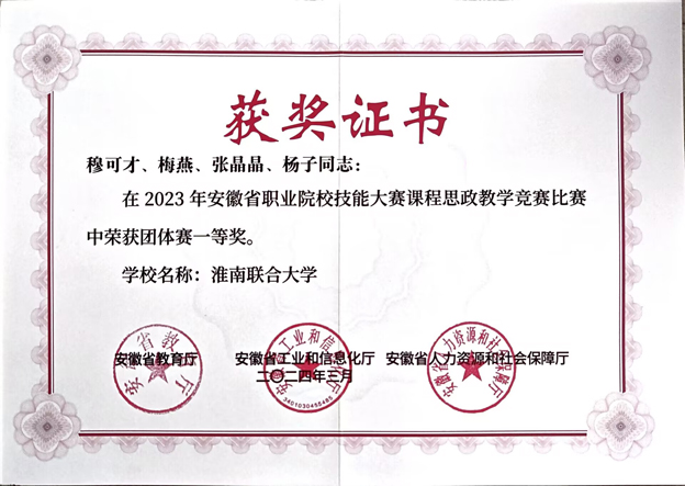 2021年4月,马院孟冰燕副教授录制的《不忘初心学党史 砥砺前行育新人》教学视频成功入选全省高校“思政课名师讲党史”栏目;获 2022 年安徽省教师能力大赛高职高专院校公共课教学组二等奖2项;2023年安徽省教师能力大赛高职高专院校公共课教学组三等奖1项;2024年安徽省教师能力大赛高职高专院校公共课教学组二等奖1项,三等奖1项。2023年获淮南市大中小思政课一体化教学比赛二等奖1项。2024年获淮南市大中小思政课一体化教学比赛三等奖2项。