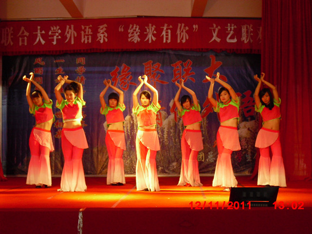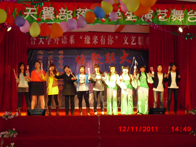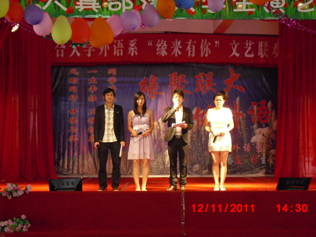 联欢会在09日语班轻松活泼的开场舞《眉飞色舞》中拉开了帷幕。一首《同桌的你》,唱出了09级学生对母校、老师和同学的不舍之情,当歌手唱到动情之处时禁不住地哽咽起来,引发了全场观众潸然泪下。难忘的师恩、珍贵的友情、往昔的点滴……一切都定格在那个瞬间,成为大学时代最美好的回忆。涂书记情倾的一首《永远是朋友》,表达了对毕业学子们的真心祝福和美好祈愿。系学生会干部的小合唱,唱出了他们对外语系这个大家庭的深深眷恋。难舍难离的情感、沁人心脾的感动,洒落在现场的每一个角落。也许他们的歌声不是最美的,但他们的情感却是最真的。舞蹈《荷塘月色》的唯美优雅、《睫毛弯弯》的青春律动,小品《趣味采访》的活泼搞笑,将晚会气氛一次次地推向高潮。由18位男女同学出演的印巴热舞,更是群情激扬,他们舞出了青春洋溢,舞出了团队精神,更是舞出了外语学子的朝气和自信,进而拉开了假面舞会的序幕。轻松的音乐,曼妙的身姿,波涛起伏的眩动展现了外语学子们多姿多彩的精神风貌。大家随着乐曲不停地舞着、旋着,一曲又一曲,一支又一支……最后,联欢会在大家依依不舍中完美落幕。