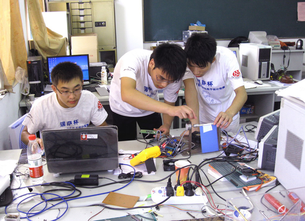 8月31日上午8时整,比赛正式开始,beat365中文官方网站的分赛场设在东教学楼单片机实验室。每队均由3名队员组成,在选定竞赛试题后,便立即开始了讨论试题,确定方案,在组委会巡视员的全程监督下,参赛选手昼夜奋战、奋力拼搏,相互协作,默契配合,力争取得优异成绩。经过四天三夜的相对封闭式制作后,于9月3日圆满完成大赛规定的内容,包括设计方案、设计电路、仿真、制作电路板、安装、测试,设计报告,按规定时间封装提交了作品,充分展示了机电系学生扎实的理论基础、创新的思维方式、娴熟的操作技能和良好的团队协作能力。