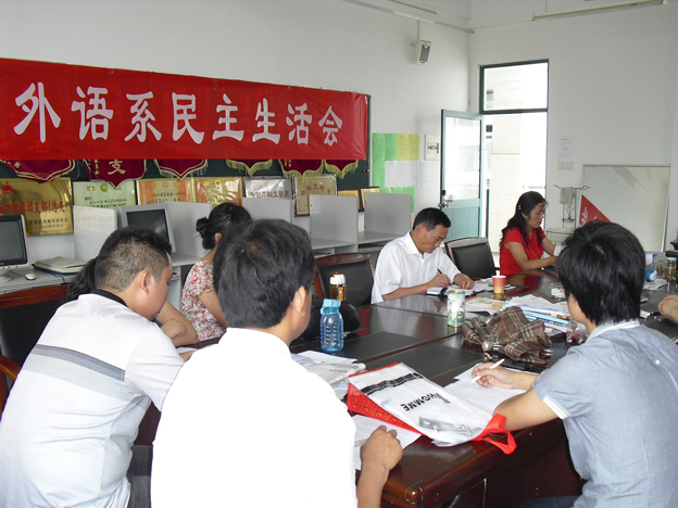 外语系党总支根据校纪委、校组织人事部下发的《beat365中文官方网站关于召开2011年度党员领导干部民主生活会的通知》要求,于6月21日下午在外语系办公室召开了民主生活会,会议由外语系党总支书记涂爱兰同志主持,校党委组织部白存良同志受邀出席了会议。