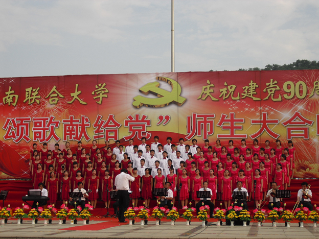 “相约长山脚下,唱响魅力联大;展现多彩外语,献礼盛世中华”,这铿锵有力的口号表达了外语学子爱国、爱党、爱校的心声,展现了外语人奋发向上、团结一致的精神风貌,外语系师生用真情和崇敬演绎着红歌《今天是你的生日》和《迎风飘扬的旗》。外语系合唱队创意新颖的造型、飘逸靓丽的着装、激情高昂的歌声、淡定自信的神情、温婉柔情的曲调、激扬跳跃的音符勾勒出了一幅清新亮丽、自然和谐、完美无瑕的画面,赢得了在场观众连绵不断的掌声。