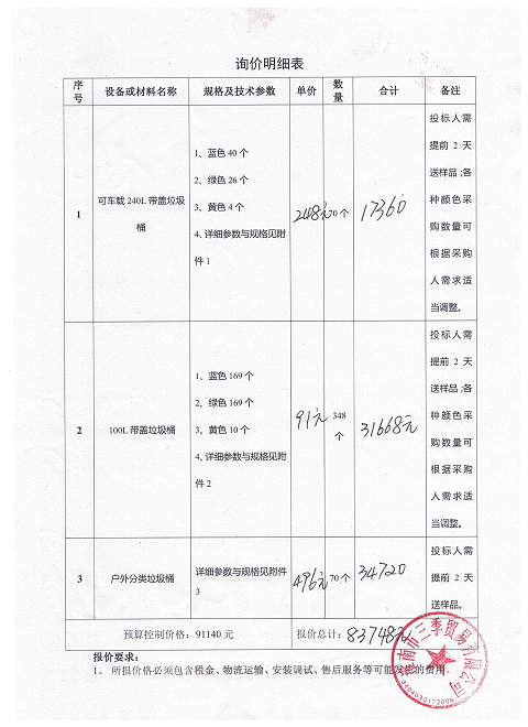 2018年垃圾桶采购项目询价采购工作已经结束,现将询价结果公示如下: