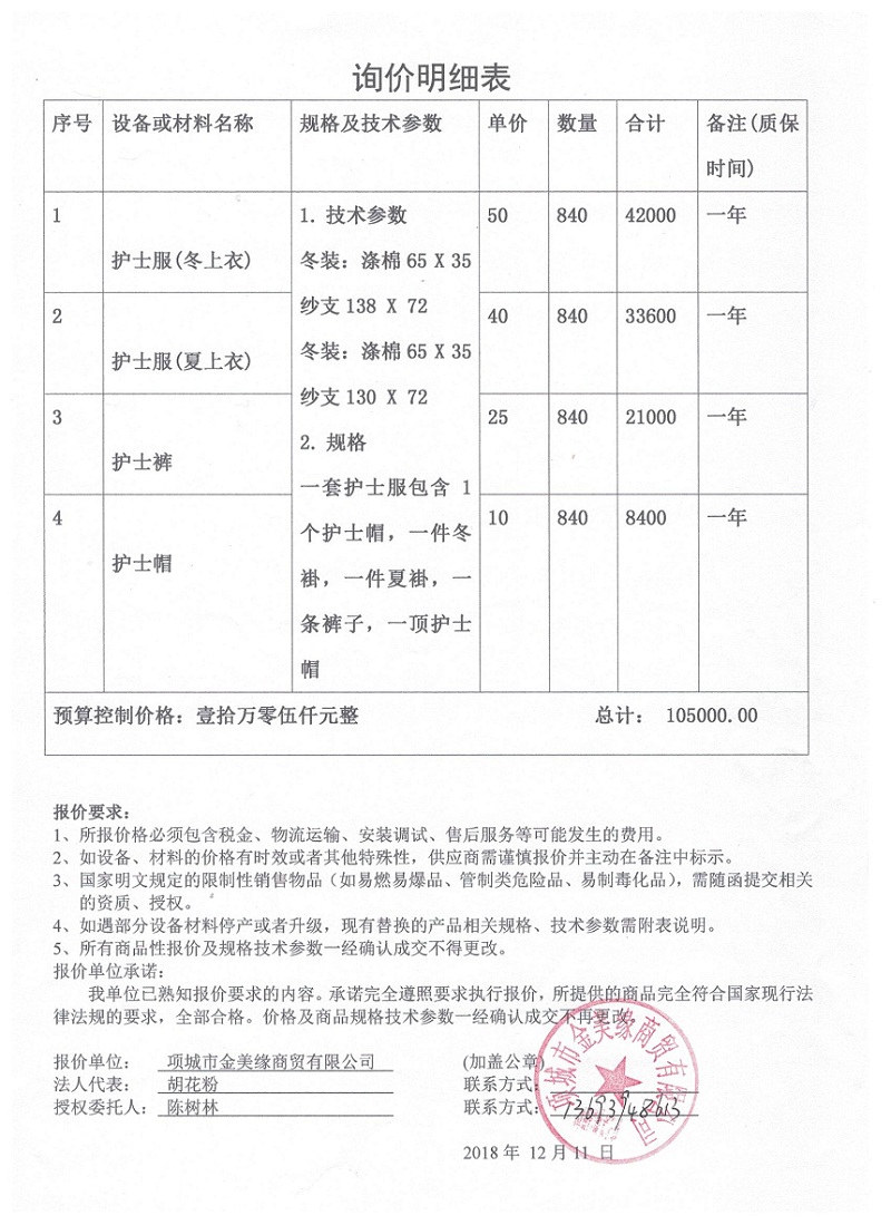 2018年医学院采购护士服询价采购工作已经结束,现将询价结果公示如下: