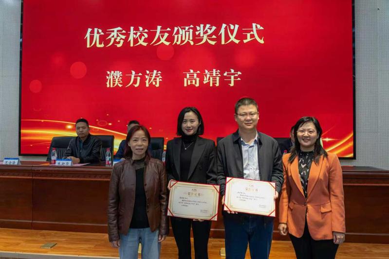 赵冰处长与黄涛珍主任共同为优秀校友高婧宇、濮方涛颁奖。